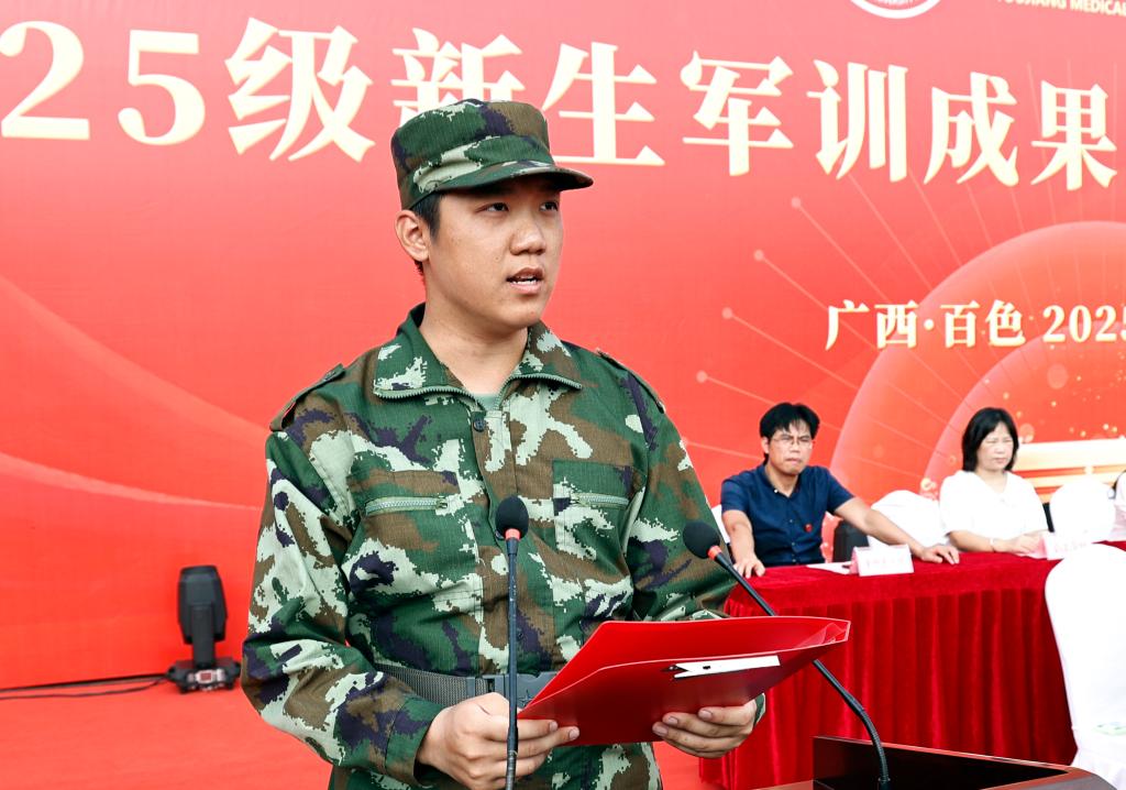 医学技术与人工智能学院2025级卫检班黄浩家代表受训新生发言,他表示,军训教给我们的,不只是站军姿、走正步,更是一种昂扬的生活态度,一种坚韧的奋斗精神,未来会将这份铁的纪律、钢的意志和团结的精神,融入未来的学习与生活,将秉承着“大医精诚”的校训,积极践行医学生的使命与担当。