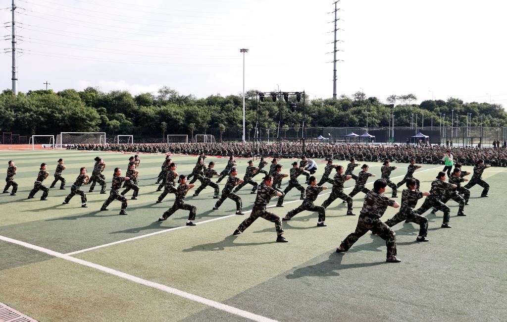 当天上午9时,典礼在庄严的国歌声中拉开帷幕,军训成果汇报展演正式开始。各连队方阵迈着铿锵有力的步伐依次走过主席台,接受检阅。在分列式的汇演中,各方队迈着铿锵有力的步伐通过主席台,步伐整齐划一,摆臂高度精准一致,每一步都踏得坚实有力;方阵口号响彻云霄,呐喊声饱含激情,尽显新生的蓬勃朝气与军人的钢铁意志。军体拳方阵动作一招一式彰显军人气魄;刺杀操方阵气势如虹,喊杀声震耳欲聋,弓步刺、马步刺等动作精准利落。新生们以饱满的热情、昂扬的斗志完成了各项展演科目,充分展现了14天军训的丰硕成果,自信展现着军事训练带来的蜕变与成长,赢得了现场师生的阵阵掌声。